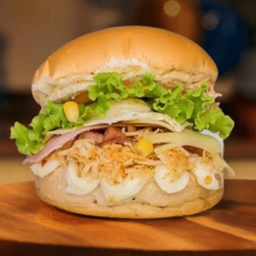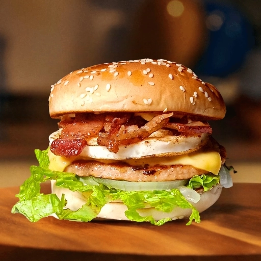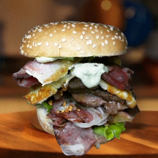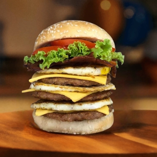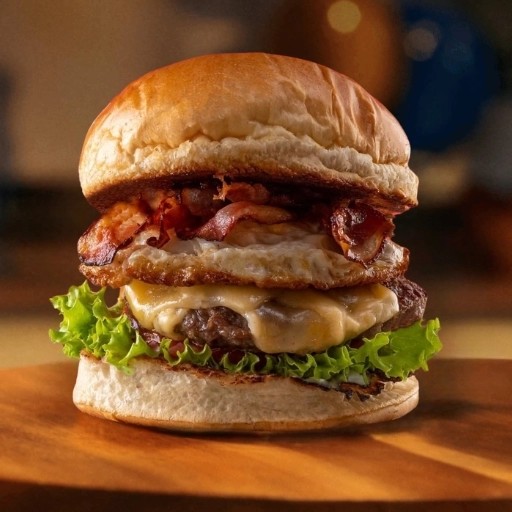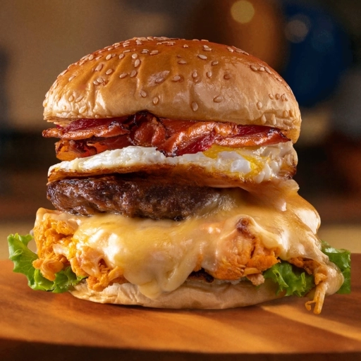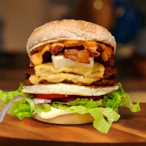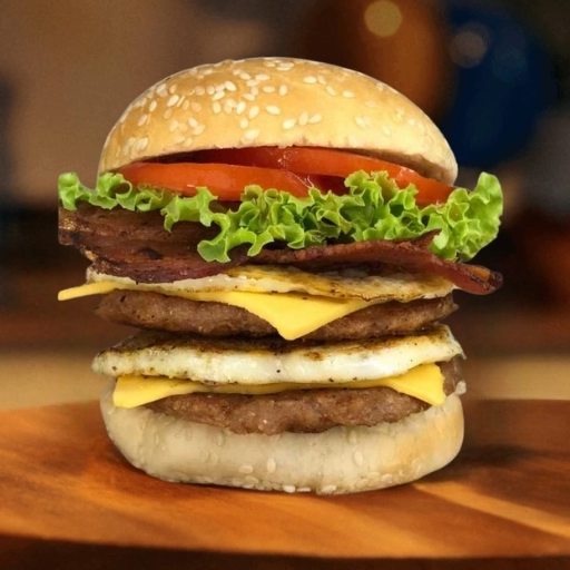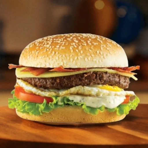 Pão, 2 carnes de hambúrguer 56g, 2 fatias de presunto, 2 fatias de queijo, 2 ovos, bacon, batata palha e salada