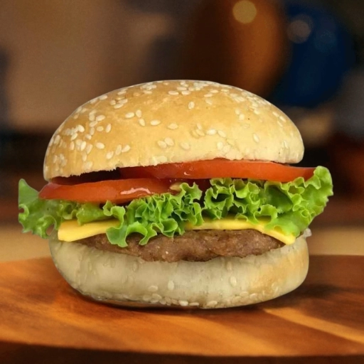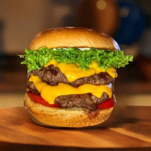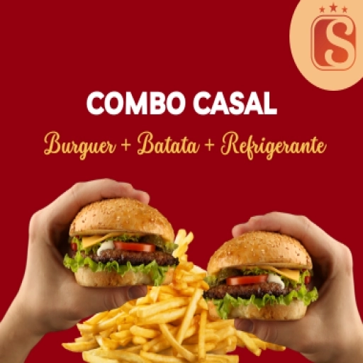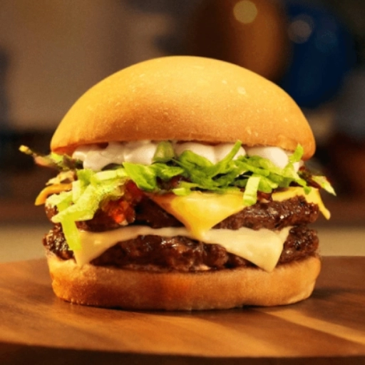 Pão, 2 carnes de hambúrguer 56g, 2 fatias de queijo, batata Palha e salada