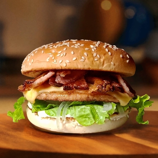 Pão, bacon, blend de 100g, cheddar fatia, frango desfiado, ovo e salada