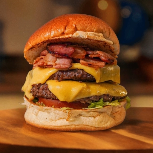 Pão, 2 carnes de hambúrguer 56g, 2 fatias de cheddar, bacon, batata palha, cebola branca e salada